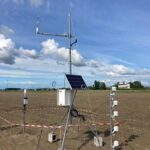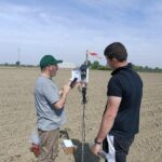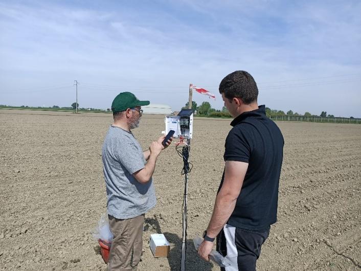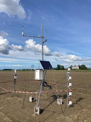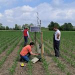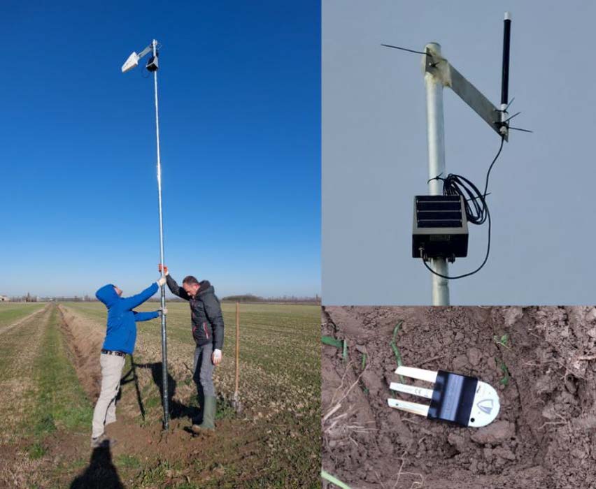 Posa dei sensori di temperatura e umidità del suolo, centralina che raccoglie i dati in wifi dai sensori e dettaglio di uno dei sensori installati nelle diverse tesi dei tre siti dove sono state implementate le cover crop.