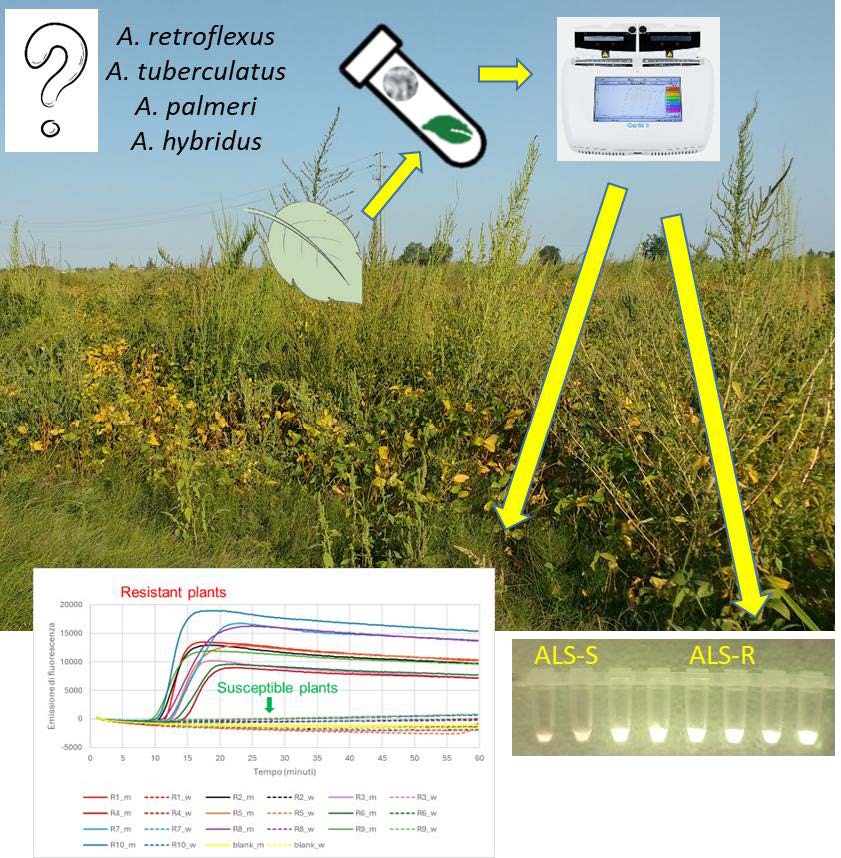 Schema riassuntivo dell’attività di diagnostica della resistenza agli inibitori dell’ALS per quattro specie di Amaranthus tramite LAMP
