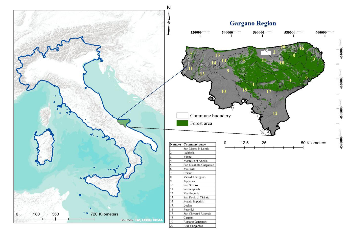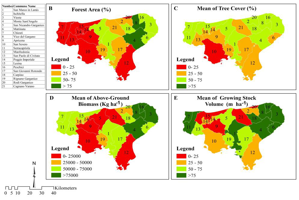 • Mappe dettagliate per ciascun comune dell’area del Gargano con variabili ambientali e forestali.
