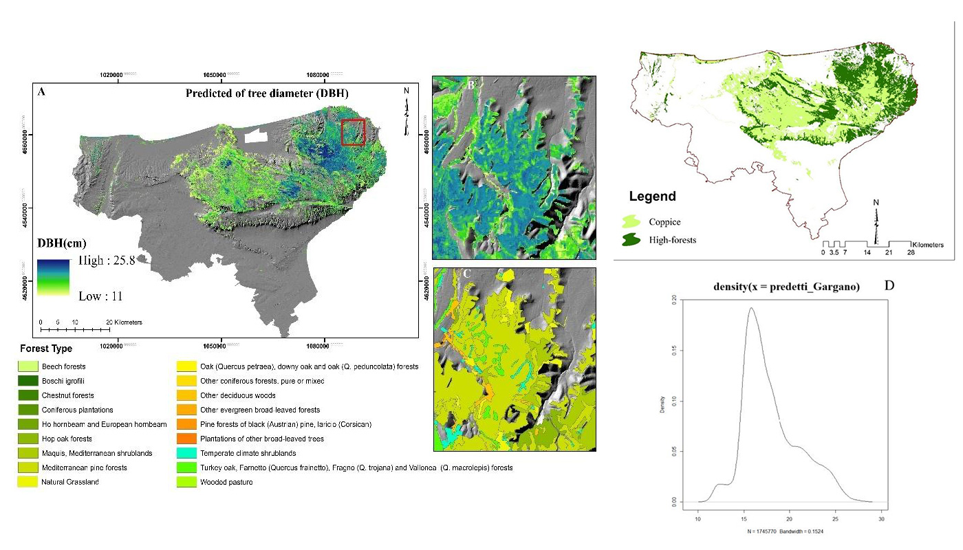 Il progetto mira a sviluppare modelli su piccola scala per supportare le filiere forestali legnose e non legnose e migliorare la fornitura di servizi ecosistemici nell’area del Parco del Gargano (Puglia, Italia). Sono stati utilizzati modelli predittivi basati su dati spaziali dettagliati per creare mappe municipali che rappresentano variabili chiave come altitudine, pendenza, biomassa aerea e diametro medio degli alberi. Una regressione lineare multipla ha permesso di stimare il diametro medio a ogni punto della mappa, integrando variabili ambientali e morfologiche. Inoltre, è stato sviluppato un modello di classificazione per distinguere tra cedui e boschi ad alto fusto, evidenziandone la distribuzione secondo caratteristiche ambientali e pratiche di gestione tradizionali.